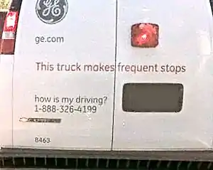A "how's my driving" sign (or "how is my driving" or similar) is a decal posted or painted on a back of a fleet vehicle or other vehicle operated by an employee driver. The decal usually has a phone number or website address and other identifying information so that the public can call and report on the behavior of the vehicle's driver. Depending on the company, the phone number or website is monitored by the vehicle's owner or by a third-party company.[1]