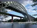 The eastern bridge, the older of the two and still often referred to as Årstabron ("The Årsta Bridge"), is still in operation almost 80 years after its inauguration in 1929. When projected in the early 1920s, an agreement between the state and the city stipulated the arterial railway passing through the city had to be made independent of the sea route passing beneath it. It was therefore decided that the railway should be relocated to a bridge passing over Årsta holmar, with a horizontal clearance of 26 metres ensured by a bascule bridge over the northern passage, and a truss arch bridge (The truss is the old one) over the southern passage offering a span of 100 metres.[1]