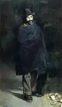 In 1856, Manet opened a studio. His style in this period was characterized by loose brush strokes, simplification of details, and the suppression of transitional tones. Adopting the current style of realism initiated by Gustave Courbet, he painted The Absinthe Drinker (1858–59) and other contemporary subjects such as beggars, singers, Gypsies, people in cafés, and bullfights. After his early career, he rarely painted religious, mythological, or historical subjects; religious paintings from 1864 include his Jesus Mocked by the Soldiers,[6] in the Art Institute of Chicago, and The Dead Christ with Angels,[7] in the Metropolitan Museum of Art, New York. Manet had two canvases accepted at the Salon in 1861. A portrait of his mother and father, who at the time was paralysed and robbed of speech by a stroke, was ill-received by critics. The other, The Spanish Singer, was admired by Théophile Gautier, and placed in a more conspicuous location as a result of its popularity with Salon-goers. Manet's work, which appeared "slightly slapdash" when compared with the meticulous style of so many other Salon paintings, intrigued some young artists. The Spanish Singer, painted in a "strange new fashion[,] caused many painters' eyes to open and their jaws to drop."[lower-alpha 1]