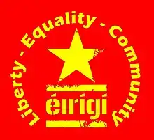 Éirígí (Irish pronunciation: [ˈeːɾʲiːɟiː]), officially Éirígí For A New Republic, is a socialist republican political party in Ireland.[4] The party name, Éirígí, means "Arise" or "Rise Up" in Irish, and is a reference to the slogan "The great only appear great because we are on our knees. Let us rise!" used by Irish socialists James Connolly and Jim Larkin.[5] Éirígí was formed in 2006 by a group of community and political activists who broke away from Sinn Féin, believing that party was not committed enough to socialism.[1]