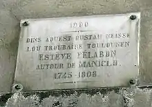 Plate that says in occitan : "In this house the troubadour Etienne Pélabon, Maniclo's