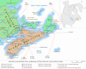 The Treaty of Utrecht, which brought an end to the War of the Spanish Succession, broke the equilibrium that existed in North America between Great Britain and France. This treaty marked the start of the reduction of French royal authority in this region of the world. France recognized the rights of Great Britain on the Hudson Bay region and also ceded continental Acadia, Newfoundland and Saint Pierre and Miquelon.[1] The territory of modern New Brunswick was a source of contention between Great Britain and France for 50 years, which was only to be resolved by the Treaty of Paris in 1763 with the abject surrender of the French.