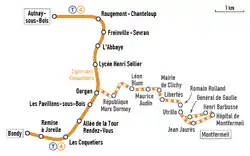 Layout no 4 was adopted by the STIF Council on 11 April 2012.[26][27] The new T4 branch will therefore create a direct route between Clichy-sous-Bois and Montfermeil. It will connect with the RER E and the forthcoming Line 15 of the Grand Paris Express in Bondy and the forthcoming Line 16 of the same network in Montfermeil.[28]