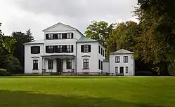 The resulting building was a simple, white-washed Neoclassical building, typical of Ramée's work around that time. Ramée also designed the surrounding park which was laid out in English style as a Romantic landscape garden with an artificial lake and grotto.