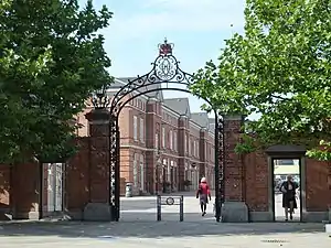 The symmetrical complex was laid out around a central axis extending diagonally into the main entrance on the corner of Østerbrogade and present day Gunner Nu Hansens Plads. The gate is topped by King Frederick VII's monogram and flanked by two guardhouses with hipped roofs. The buildings are designed in a Neo-Baroque style and built in red brick with white window frames and Mansard Roofs with blue-glazed tiles.[1]