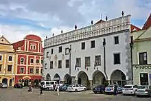 The centre of Old Town is formed by Svornosti Square. Its main landmark is the town hall from 1597. It was created by merger of three Gothic houses with arcades, whose façade was merged with a Renaissance attic.[16]