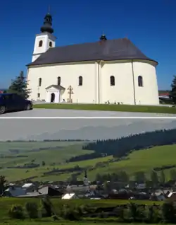 ![]() Montage from top- Church of St Emeric, Skyline of the village with neighbouring Skorušina mountains | |