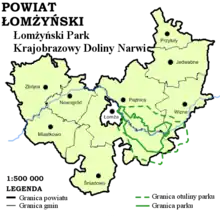 Map of Łomża County, with the outline of Łomża Landscape Park marked in green. Protected area marked by a dashed green line. Narew river marked in blue