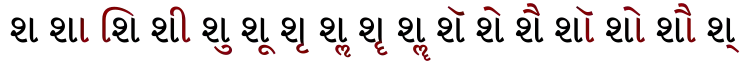 | श | शा | शि | शी | शु | शू | शृ | शॄ | शॢ | शॣ | शे | शै | शो | शौ | श् |