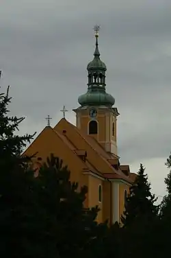 Roman - Catholic Church with Paulin's monastery was built in late-baroque style in 1778 by J. G. Altenburg. This church has got a single-nave hall with segmented breech of presbyter and barrel-vault with groins. Facade of the church is divided by pilasters. The portal with profiled chambranle has got thin pilasters with a volute on a sett. This sett is based on these pilasters and it is also finished by cut profiled cornice with a cross. The tower built into the pinnacle facade is hidden by a ball-shaped polygonal lantern. In the inside of the church are fresco paintings by Fr. Sigrist (1778). The interior is designed in late-baroque style and the interspace is solved in a particular way of uniformity. In the western side breech of sacrarium is stucco relief of Godfather.