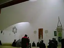 The central space of the mosque is designed both for praying and other religious activities such as lectures and discussions. The indoor area for praying is an annex building. The annex consists of a small auditorium and an office. Traditionally, in Bosnian mosques, graveyards act as a buffer between mosque and other buildings, but in this case, the graveyard is isolated. Architect Zlatko Ugljen used the traditional layout of Bosnian mosques which consist of a courtyard leading to a square praying area, over which rises a cupola. The difference is in an unusual arrangement of this concept, where large glass panels make this mosque more integrated with the rest of the building. Windows with five panels symbolizes Five Pillars of Islam, but also casts light in the interior. The southeast facade of the cupola is faced toward the Ka'ba. Fountains, pulpit and other decorative elements are simple, just like the calligraphy in the interior which is simple and readable. Both the interior and exterior of the mosque are painted white, while the beige color was used for the floor, and green for a few metallic elements, like frames and tubes.