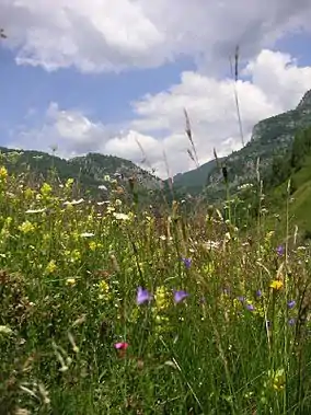The Șureanu Mountains are divided into the Sebeș Mountains to the east and the Orăștiei Mountains to the west. In all, they cover an area of 1,585 square kilometres (612 sq mi). The highest peak is Peter's Peak (Vârfu lui Pătru), at 2,130 metres (6,990 ft);[1] other peaks are Șureanu Peak, at 2,059 m (6,755 ft) and Vârfu Negru, at 1,862 m (6,109 ft), as well as Aușelu, Comărnicelul, Gropșoara, and Pârva peaks. They are primarily a highland with meadows and pastures, with very large forested area throughout the surrounding 1,200 to 1,400 metres (3,900 to 4,600 ft) high mountains. In the southern area of these mountains there is a limestone region with several caves, hills, and gorges.