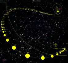 ʻOumuamua appears to have come from roughly the direction of Vega in the constellation Lyra.[52][53][58][59] The incoming direction of motion of ʻOumuamua is 6° from the solar apex (the direction of the Sun's movement relative to local stars), which is the most likely direction from which objects coming from outside the Solar System should approach.[58][60] On 26 October, two precovery observations from the Catalina Sky Survey were found dated 14 and 17 October.[61][50] A two-week observation arc had verified a strongly hyperbolic trajectory.[7][47] It has a hyperbolic excess velocity (velocity at infinity, ) of 26.33 km/s (94,800 km/h; 58,900 mph), its speed relative to the Sun when in interstellar space.[lower-alpha 4]