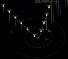 On the outward leg of its journey through the Solar System, ʻOumuamua passed beyond the orbit of Earth on 14 October with a closest approach distance of approximately 0.1618 AU (24,200,000 km; 15,040,000 mi) from Earth. On 16 October it moved back north of the ecliptic plane and passed beyond the orbit of Mars on 1 November.[68][58][7] ʻOumuamua passed beyond Jupiter's orbit in May 2018, beyond Saturn's orbit in January 2019, and will pass beyond Neptune's orbit in 2022.[68] As it leaves the Solar System it will be approximately right ascension 23'51" and declination +24°45', in Pegasus.[10] It will continue to slow down until it reaches a speed of 26.33 kilometres per second (94,800 km/h; 58,900 mph) relative to the Sun, the same speed it had before its approach to the Solar System.[10]