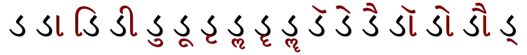 | Dda | Ddā | Ddi | Ddī | Ddu | Ddū | Ddr̥ | Ddr̥̄ | Ddl̥ | Ddl̥̄ | Dde | Ddai | Ddo | Ddau | Dd |