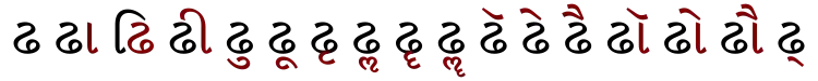 | ढ | ढा | ढि | ढी | ढु | ढू | ढृ | ढॄ | ढॢ | ढॣ | ढे | ढै | ढो | ढौ | ढ् |