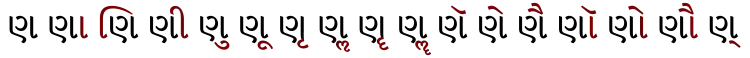| ण | णा | णि | णी | णु | णू | णृ | णॄ | णॢ | णॣ | णे | णै | णो | णौ | ण् |