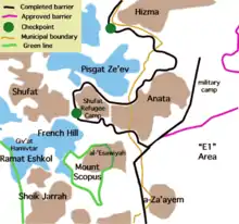 After the 1995 accords, about 3.8% of the land (or 918 dunams) is classified as being Area B, while the remaining 96.2 % (or 23,108 dunams) is Area C.[30] Most of the lands of 'Anata have been confiscated by Israel.[28] Of the 1877 dunums which remain in residents' hands, after creation of the Palestinian National Authority in 1994, 957 dunums became part of Area B, 220 dunums part of Area C, and 700 dunums have been declared a closed military zone by the Israeli authorities.[28] The Dahyat as-Salam neighbourhood has been annexed by Israel as part of the Jerusalem municipality.[28] The village boundaries are far-reaching and stretch from 'Anata itself to just east of the Israeli settlement of Alon.[31] Most of the land is undeveloped open space with little or no vegetation.[31]