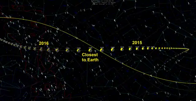 It was observed in December 2015 at a distance of 28.3 lunar distances (0.07296 AU) on December 24, and its brightest was 15.22 magnitude on December 16. It showed an elongated shape, up to 2 km wide, described as being shaped like a sweet potato.