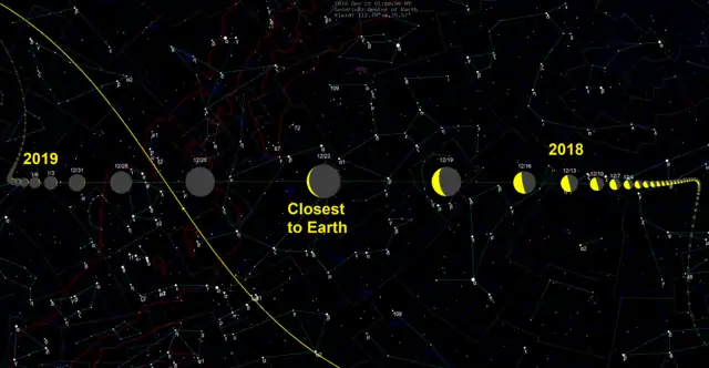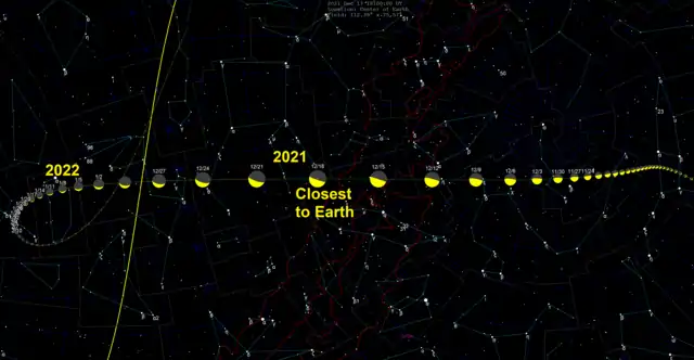Its peak brightness was about 13.1 magnitude on 16 December 2018, moving south from Ursa major and Boötes into Ophiuchus at closest approach and into Sagittarius.