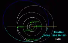 (26308) 1998 SM165 is a resonant trans-Neptunian object and binary system from the Kuiper belt in the outermost regions of the Solar System. It was discovered on 16 September 1998, by American astronomer Nichole Danzl at the Kitt Peak National Observatory in Arizona.[1] It is classified as a twotino and measures approximately 280 kilometers in diameter. Its minor-planet moon was discovered in 2001.[5]
