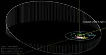 2008 ST291 is located at the 1:6 Neptune resonance of 99 AU meaning that it completes roughly 1 orbit for every 6 orbits Neptune makes.[3] It orbits the Sun at a distance of 42.3–157.5 AU once every 998 years and 4 months (semi-major axis of 99.89 AU). Its orbit has an eccentricity of 0.58 and an inclination of 21° with respect to the ecliptic.[4] Currently located at 60.9 AU from the Sun,[6] the object came to perihelion in 1954.[4]