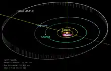 2003 QX113 last came to perihelion around 1882,[4] moving away from the Sun ever since and is currently about 60.5 AU from the Sun,[9] which is further away than the dwarf planet Sedna, and will reach its aphelion around 2058.[10] Its current distance makes it one of the most distant known minor planets in the Solar System (also see List of Solar System objects most distant from the Sun § Known distant objects).[11]