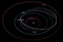 2020 XL5's high orbital eccentricity results in wide, tadpole-shaped oscillation paths in a corotating reference frame with Earth and its Lagrangian points. Although the asteroid crosses Venus's orbit with a minimum orbit intersection distance (MOID) of 0.0273 AU (4.1 million km; 2.5 million mi),[2] perturbations by the planet are currently negligible since its nominal orbit brings it either too high or too low from the plane of Venus's orbit.[16] Venus's influence on 2020 XL5's orbit will become greater over time as their longitudes of the ascending node precess over hundreds of years, lowering 2020 XL5's Venus MOID and eventually destabilizing its trojan orbit by sending it to Earth's L3 point in several thousand years.[16]