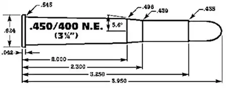 The .450/400 3¼-inch NE conversion was not initially entirely successful, under the increased pressures of the cordite loading the long neck could stick in the chamber causing the rim to pull off at extraction,[2] a problem not encountered under the milder black powder loadings. To counter this, the rim was increased in thickness to .042-inches. W.J. Jeffery & Co further improved the cartridge by reducing the length of the case to 3-inches and moving the neck further forward, creating the .450/400 3-inch NE.
