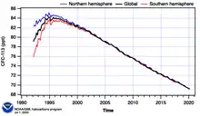CFC-113 is a very unreactive chlorofluorocarbon. It remains in the atmosphere about 90 years,[5] sufficiently long that it will cycle out of the troposphere and into the stratosphere. In the stratosphere, CFC-113 can be broken up by ultraviolet radiation (where sunlight in the 190-225 nm (UV) range), generating chlorine radicals (Cl•), which initiate degradation of ozone requiring only a few minutes:[6][7]