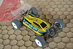 Team Associated took the realm of the race buggy further when they introduced the Roger Curtis designed RC10, a car that established the layout (motors and batteries on a flat tub chassis) that became an industry standard for all off-road buggies by industry insiders.[9][36] Taking inspiration from real off-road buggies, Curtis looked at how the suspension could be designed to cope with the high demands of off-road racing.[37] The chassis was made from anodized, aircraft grade aluminum alloy, it also featured machined, oil-filled aluminium shock absorbers that can be adjusted with high-impact nylon suspension control arms, ball differentials and two-piece wheels. It primarily proved that designs based on its real life counterpart was not the way to win races, as a result, manufacturers began to break away from realism.[9] Before this, cars sold had to be heavily modified from its stock format in order to be competitive.[29]