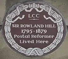 There is an LCC plaque on number 1 to Sir Rowland Hill, (1795–1879), postal reformer, who lived there from 1839 to 1842, while he was introducing the penny post.[1][3]