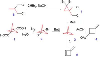 However, a much simplified synthesis was published by Szeimies.[5] It starts with dibromocarbene addition to the alkene bond of 3-chloro-2-(chloromethyl)propene 6 followed by deprotonation by methyllithium and nucleophilic displacements in 7[6] not isolated but kept in solution at −196 °C.
