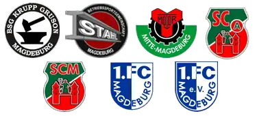 Logos of Krupp Gruson Magdeburg, Stahl Magdeburg, Motor Mitte Magdeburg, SC Aufbau Magdeburg, SC Magdeburg, early 1.FC Magdeburg and a version used for a short time at the beginning of the 1990s