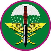 The 102nd Reconnaissance Battalion Patch has a circular shape depicting several objects which have symbolic meaning relating closely to the battalion, its sub-units or history. A white parachute represents the airborne-reconnaissance units, a pair of yellow wings represents the ability to conduct an aerial reconnaissance, a pair of yellow bolts used to represent Electronic Warfare unit which used to be a part of the 11th Reconnaissance Battalion, and nowadays it represents the ability to pass the information quickly from the battlefield and finally the assault knife which is a symbol of a long-range reconnaissance unit. The dark green color of the background of the patch represents the color of reconnaissance units in general as well as the color of scout's berets, while the dark red edge of the circle represents the color of paratrooper forces and their berets. The battalion motto is Latin: Spem retine – spes una hominem nec morte relinquit (Cato) – ("Keep hold of hope; hope alone does not desert a person even in death").