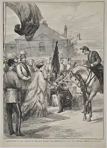 While stationed on the Isle of Wight new colours were presented by the Princess Royal on 14 August 1874, with the 1860 colours laid up at St. Thomas' church in Newport.[43] In 1879 while at Preston, the Regiment sent 455 men to its linked regiment while it was in India. In March 1880, now only 16 officers and 381 men strong, the regiment was transferred to Ireland.[45]