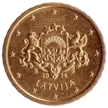 Latvian euro coins The coat of arms of the Republic of Latvia above the word LATVIJA (Latvia). 2014 onward