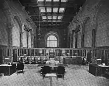 According to the New York City Landmarks Preservation Commission, the first-floor banking room measures 80 feet (24 m) wide and 197.5 feet (60.2 m) long with a 65-foot-tall (20 m) ceiling.[7][25] Architectural writer Robert A. M. Stern and Architecture and Building magazine give a figure of 75 by 200 feet (23 by 61 m), with a ceiling of 70 feet (21 m).[10][11] In any case, The New York Times described the space as one of the largest banking rooms in a New York City bank.[12] The banking room uses marble, limestone, sandstone and bronze screens to create a space reminiscent of a basilica.[7] The banking room can be entered from the 41st Street arch to the south; the 42nd Street arch to the north; the office building's vestibule to the northeast; and two doorways leading to the passenger- and freight-elevator lobbies to the west.[20] The floor slopes upward toward the south end of the room, since the 41st Street entrance is slightly higher than the entrance on 42nd Street. Another ramp slopes upward toward the "Chapel" annex to the east.[20] The 42nd Street branch had a single waiting and banking room, obviating the need for clerks to frequently walk between back-room desks and public-facing counters.[15]