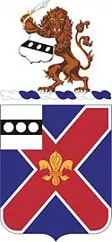 The shield is blue for Infantry. The saltire is for the Civil War service and the fleur-de-lis for World War I service. The canton represents the shield that appeared on the "Associators'" flag, indicating the Revolutionary War service of the organization. The silver saltire has been voided with red in similitude to the colors of the uniforms of the Pennsylvania troops as prescribed by General Washington in 1779. The motto was used by the 3d Infantry, Pennsylvania National Guard, for a number of years.