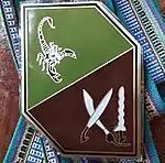 The official seal of the Division is an irregular hexagon divided in half with a scorpion (Filipino: Alakdan) over a green field on top and two crossed bolos and a kris over a brown field below.