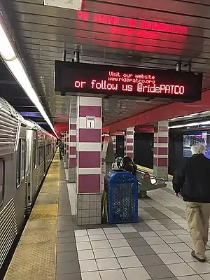 12–13th & Locust station is a PATCO Lindenwold Line subway station in Washington Square West, Center City, Philadelphia. The station has a single island platform, with a fare mezzanine above. The mezzanine level connects to the Center City Pedestrian Concourse, which connects subway and regional rail stations in the Center City area.