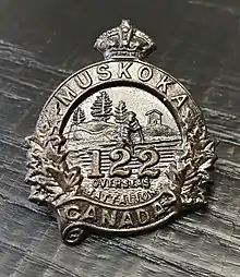 The 122nd Overseas Battalion, CEF was a unit in the Canadian Expeditionary Force during the First World War. Based in Huntsville, Ontario & Bracebridge, Ontario the unit began recruiting in late 1915 in the Muskoka district. After sailing to England in June 1917, the battalion was absorbed into the Canadian Forestry Depot on June 9, 1917. The 122nd Battalion, CEF had one Officer Commanding: Lieut-Col. D. M. Grant.