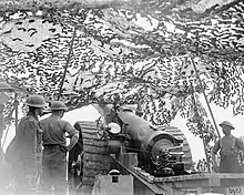 The battery left Cullercoats on 4 June to join R Siege Brigade (Training) at Horsham and after a month moved to Lydd to complete its training, first with B Bde, then with C Bde. On 29 July the battery began to move to Bristol to mobilise, where its guns were waiting. The battery was equipped with four 8-inch howitzers.[5][6] At this stage of the war the 8-inch howitzers in use (Marks I–V) were improvised from cut-down and bored-out barrels of 6-inch coast defence guns, with the recoil checked by enormous wooden wedges.[7][8]
