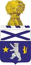 - Shield: The consolidation of the former 217th Coast Artillery Regiment with the 136th Infantry Regiment is depicted in the design: The bear cat is from the coat of arms of the 136th Infantry Regiment, World War II; the star and gopher are from the coats of arms of the former 205th and 206th Infantry Regiments, predecessors of the 217th Coast Artillery Regiment. The chief, bearing a saltire, is incorporated in this coat of arms to symbolize the Civil War service of the original 136th Infantry Regiment. The shield is blue for Infantry.