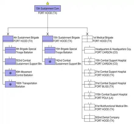 This article incorporates text from this source, which is in the public domain. - "13 Sustainment Command: Shoulder sleeve insignia". Institute of Heraldry, US Army. Retrieved 28 August 2020.