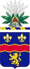 The crest has seventeen (17) silver arrows, banded by a sprig of buckeye on a wreath of blue and gold, which are the regimental colors. The seventeen arrows signify Ohio, which was the seventeenth state to be admitted to the Union. The shield is azure, for infantry, divided by a red fess, bordered by two gold bands with two fleurs-de-lis representing the offensive and defensive actions in which the Regiment participated in France. The lion represents Belgium, where the Regiment engaged in the Ypres-Lys offensive. The red fess, wavy and bordered by the two gold bands, represents the Scheldt River which, of all the allied troops, was crossed first by the 148th Infantry on 2 November 1918. The regimental motto, "We'll Do It," inscribed below the shield was inspired during this crossing and became a battle cry that inspired the members of this Regiment to rise above the normal call of duty and to go on to soundly defeat an enemy of superior numbers and to bring about a great victory for the allies.