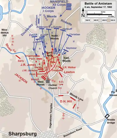 In the cornfield, the Eastern Iron Brigade followed the Western Brigade into battle early in the morning. While the rest of Phelp's brigade fell back, the 14th Brooklyn held its ground along with elements of the 6th Wisconsin of the Black Hats (Western Iron Brigade). This effort combined into a mass of soldiers pushing the Confederates up to Dunker Church. These two regiments got further than any other Union Regiment during the attack in the cornfield.