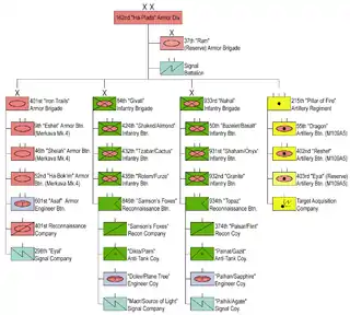 The Israel Defense Forces 162nd Armor Division, also known as the Steel Formation (Hebrew: עֻצְבַּת הַפְּלָדָה, Utzbat HaPlada), is a regular-service armor division in the IDF. It is subordinate to the Southern Regional Command. The division is led by Brigadier-General Moti Baruch.