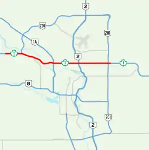 | 18.1 | 11.2 | Split diamond interchange, traffic signals; Hwy 2 exit 225 | |||