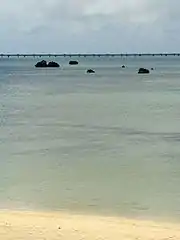 There are many huge boulders on the coasts of the Yaeyema and Miyako islands that are believed to have been deposited by tsunamis. There was a legend that an islet disappeared, but this has never been verified. This set of rocks are called the Ishigaki East Coast Tsunami Rocks.[8] Among them, Yasura-ufukane, Amatariya–Suuari and Taka-koru sishi have been dragged by the 1771 Meiwa tsunami.[9]